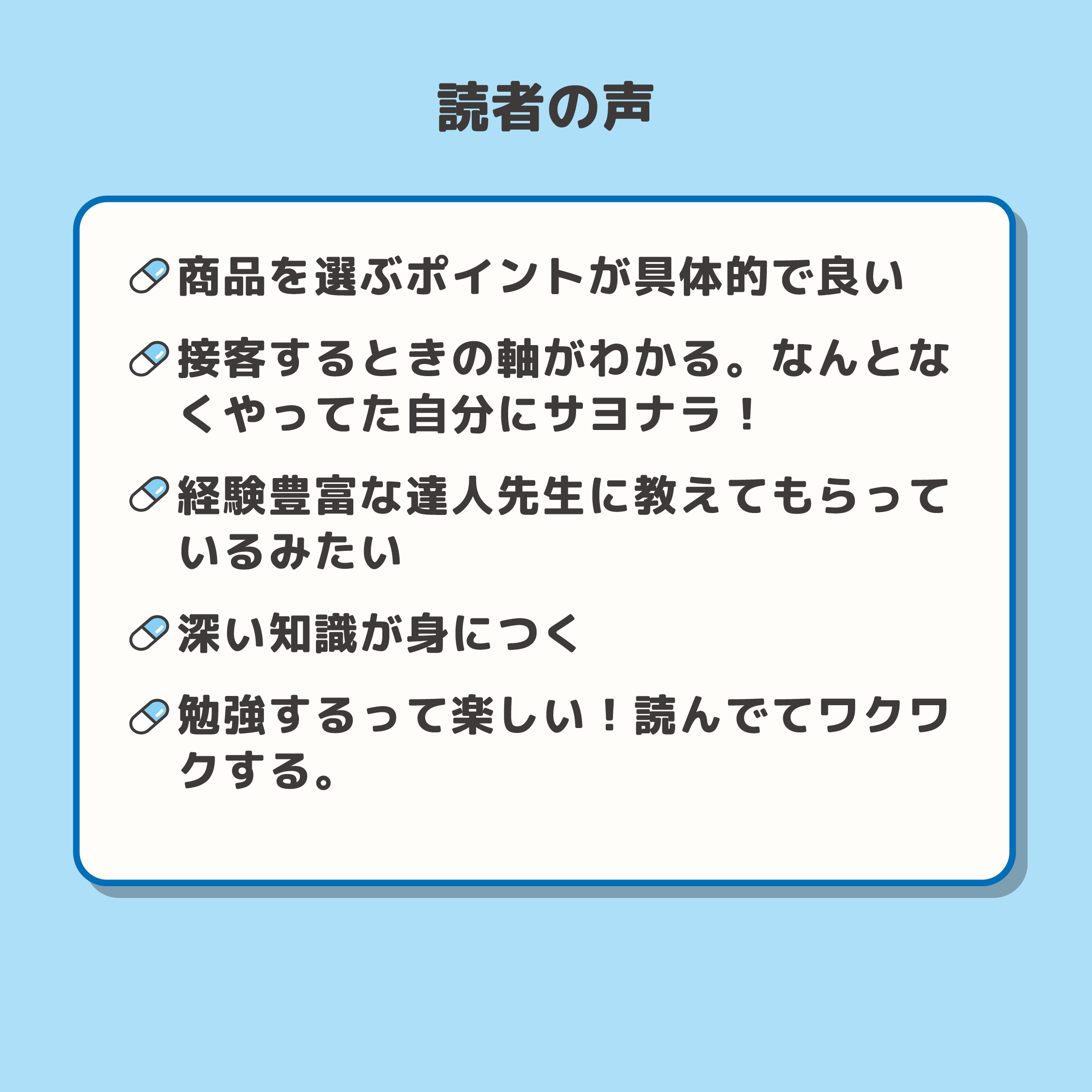 この本を通じて覚えたことは是非実際の接客で活かしてみてください。お客様のお役に立てる、こんなに嬉しいことはないですよ!(以上 “はじめ” により引用)